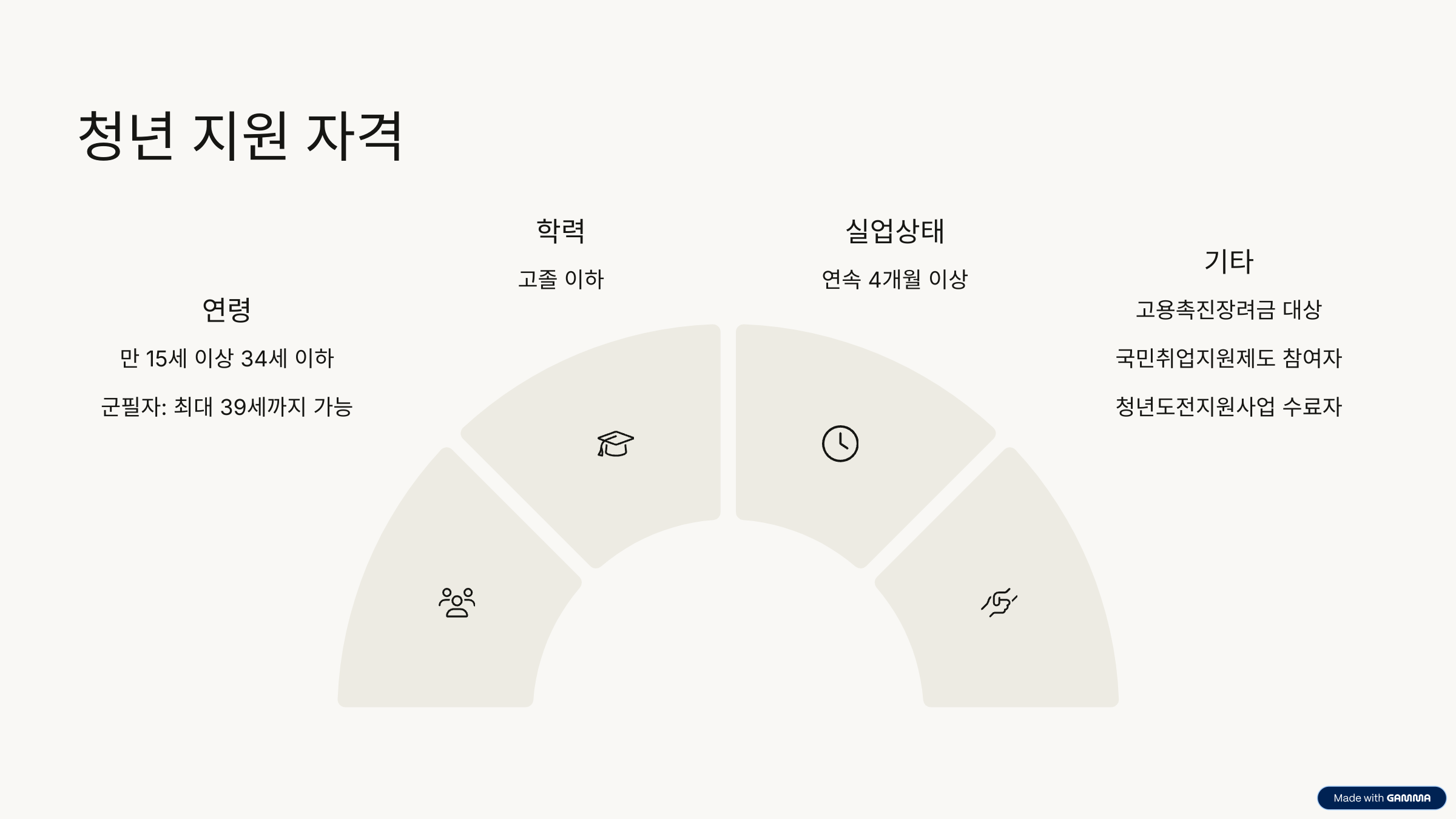 - 만 15세 이상 34세 이하의 청년 (군필자의 경우 복무기간만큼 연장 가능, 최대 39세)