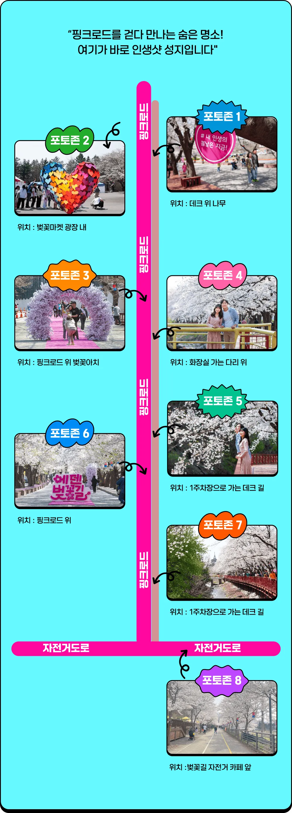 - 포토존: 1.2km에 달하는 벚꽃터널과 곳곳에 마련된 포토스팟에서 인생샷을 남길 수 있습니다.